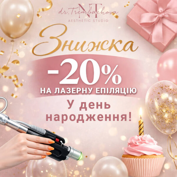 День народження — чудова нагода подбати про себе та зробити приємний подарунок. В Aesthetic studio dr. Trembachova діє спеціальна пропозиція — знижка −20% на лазерну епіляцію у день вашого народження.