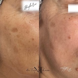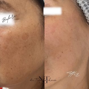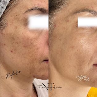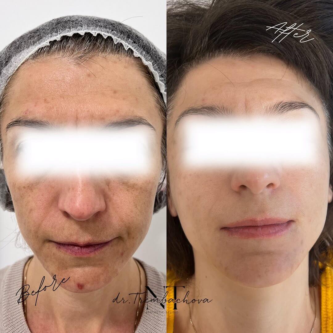 Після першої процедури шкіра може трохи набувати легкого почервоніння, але вже через кілька годин її тон стає рівномірнішим і помітно світлішим. Пігментні плями тимчасово темнішають – це нормальний етап, після якого вони поступово освітлюються або зникають повністю. Через 7-10 днів ви вже бачите реальний ефект: виразне покращення тону, гладкість і відчуття більш пружної та еластичної шкіри.